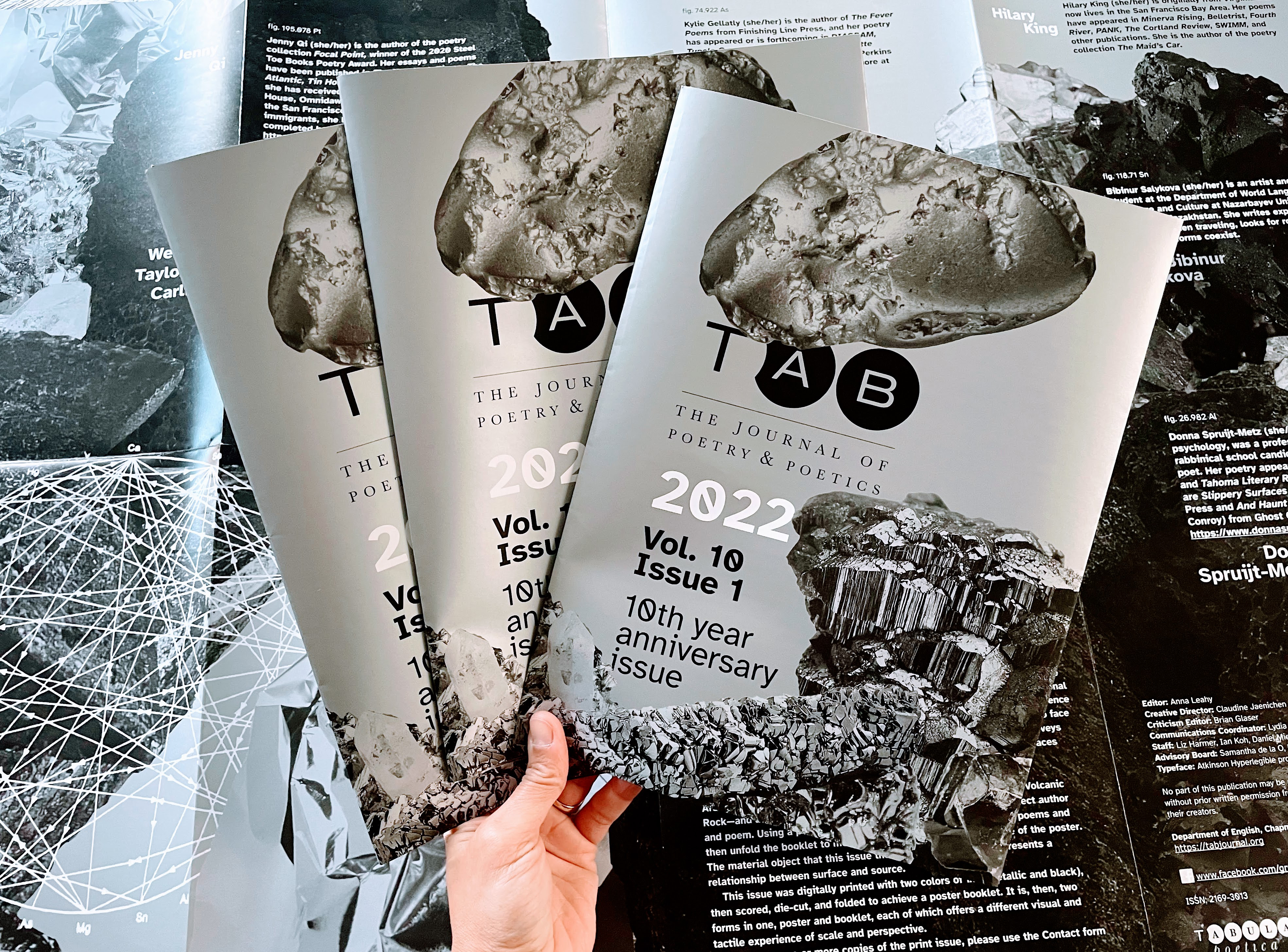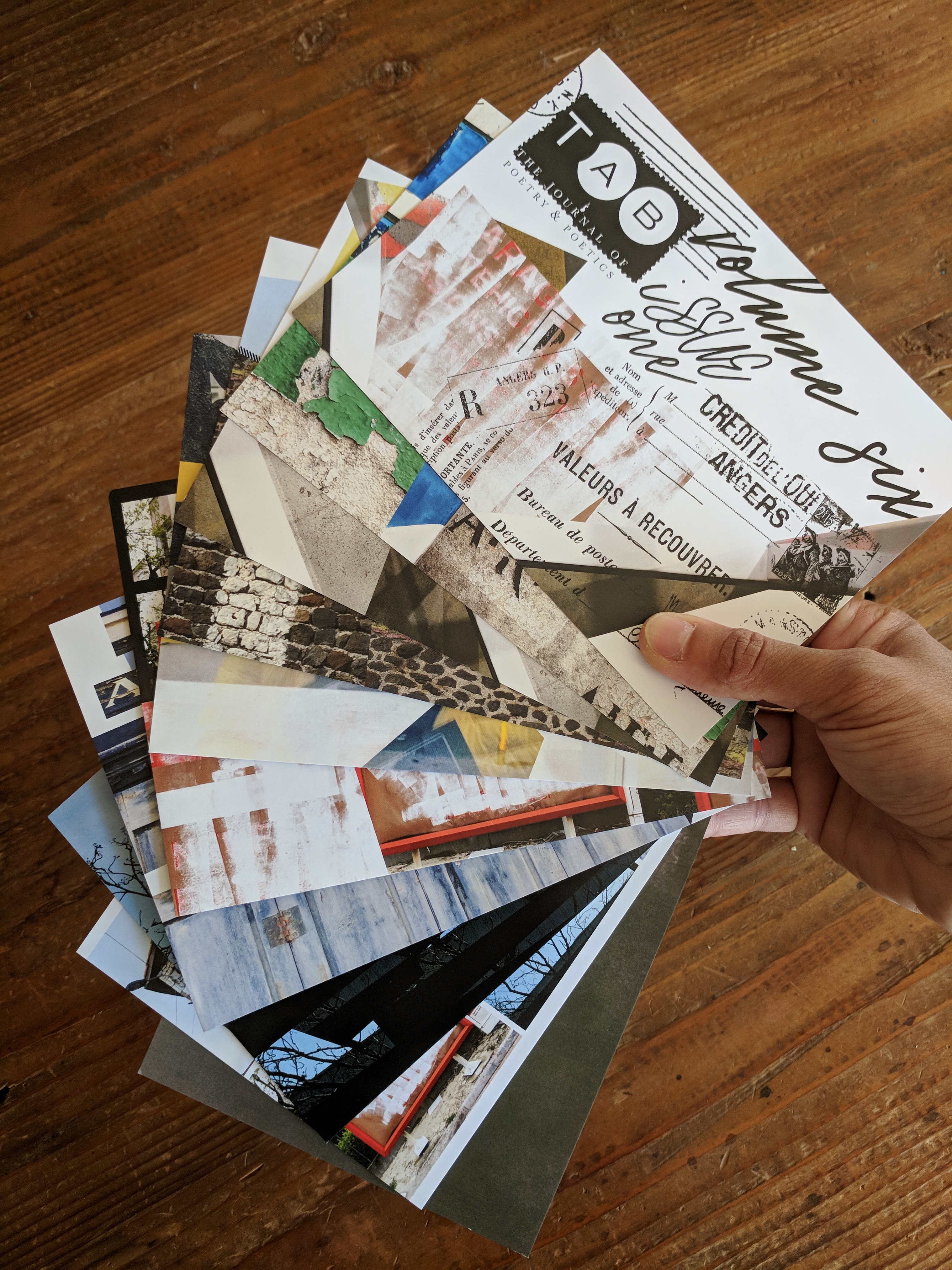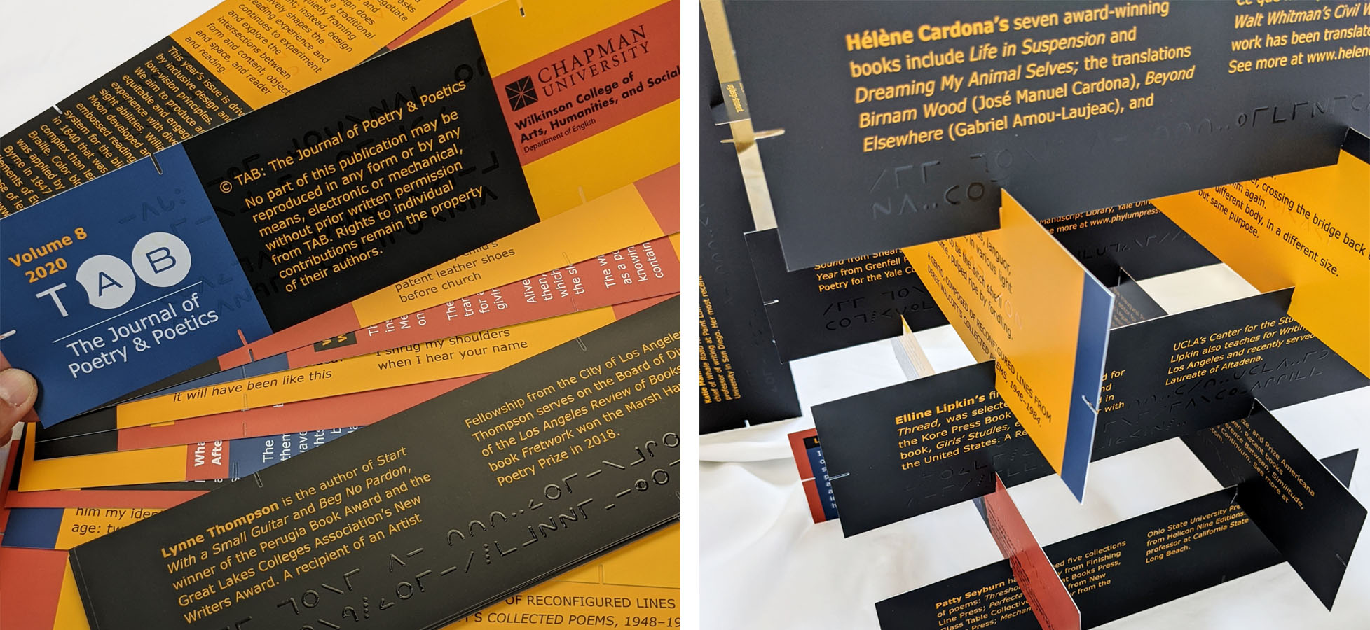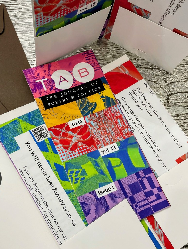 The print issues of Tab: The Journal of Poetry & Poetics are special editions, each published at the beginning of the calendar year. These issues reflect Tab Journal’s mission to create an environment that celebrates poetry in various forms and venues. The annual print issue inaugurates a different design experience for every year and engages the reader with poetry as a material object and asks that the reader negotiates between image and text.