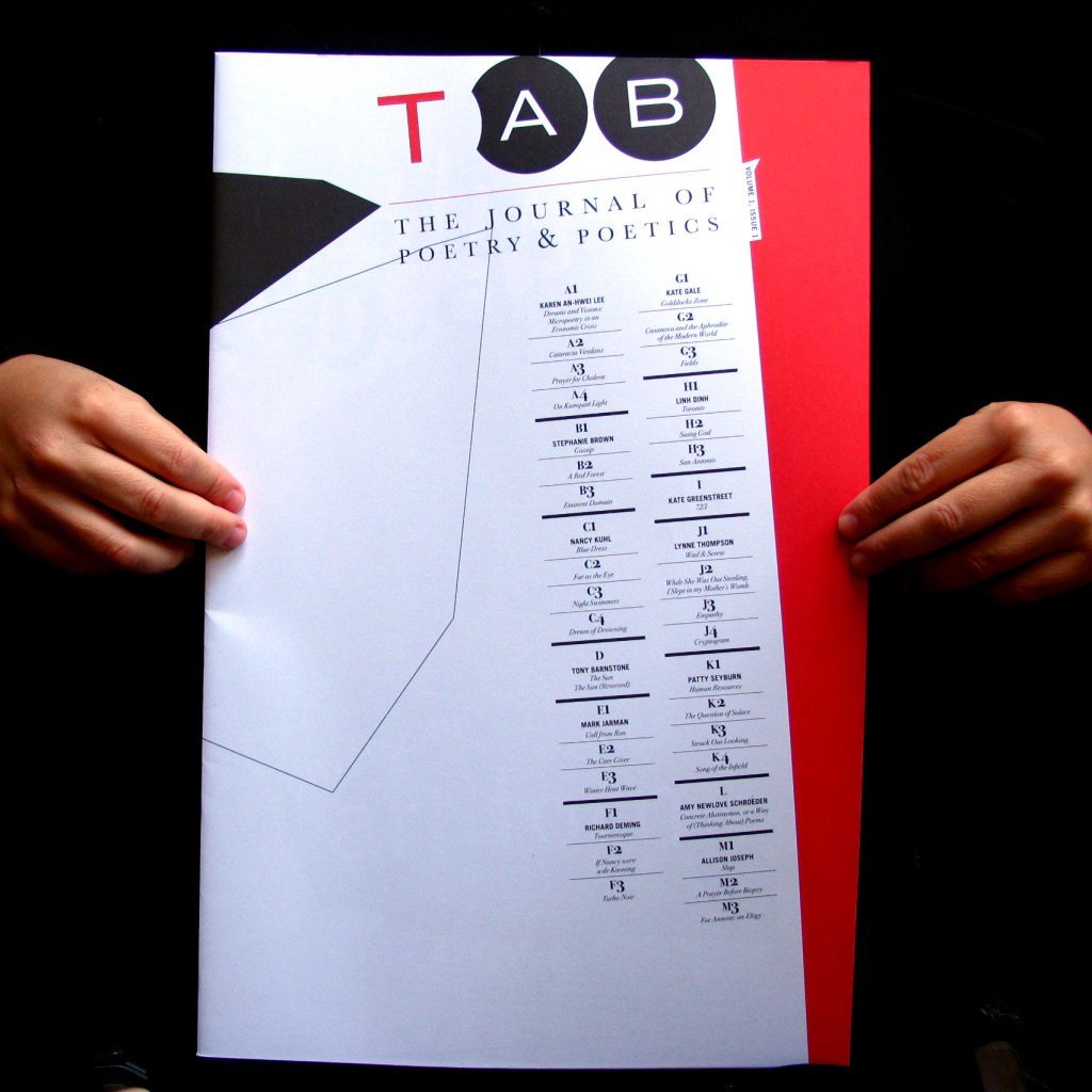 Tab: The Journal of Poetry & Poetics is a national and international journal of creative and critical writing. This new literary journal’s mission is to discover, support, and publish the contemporary poetry and writing about poetry; to provide a forum in which the poetic tradition is practiced, extended, challenged, and discussed by emerging and established voices; and to encourage wide appreciation of poetry and expand the audience for poems and writing about poetry.