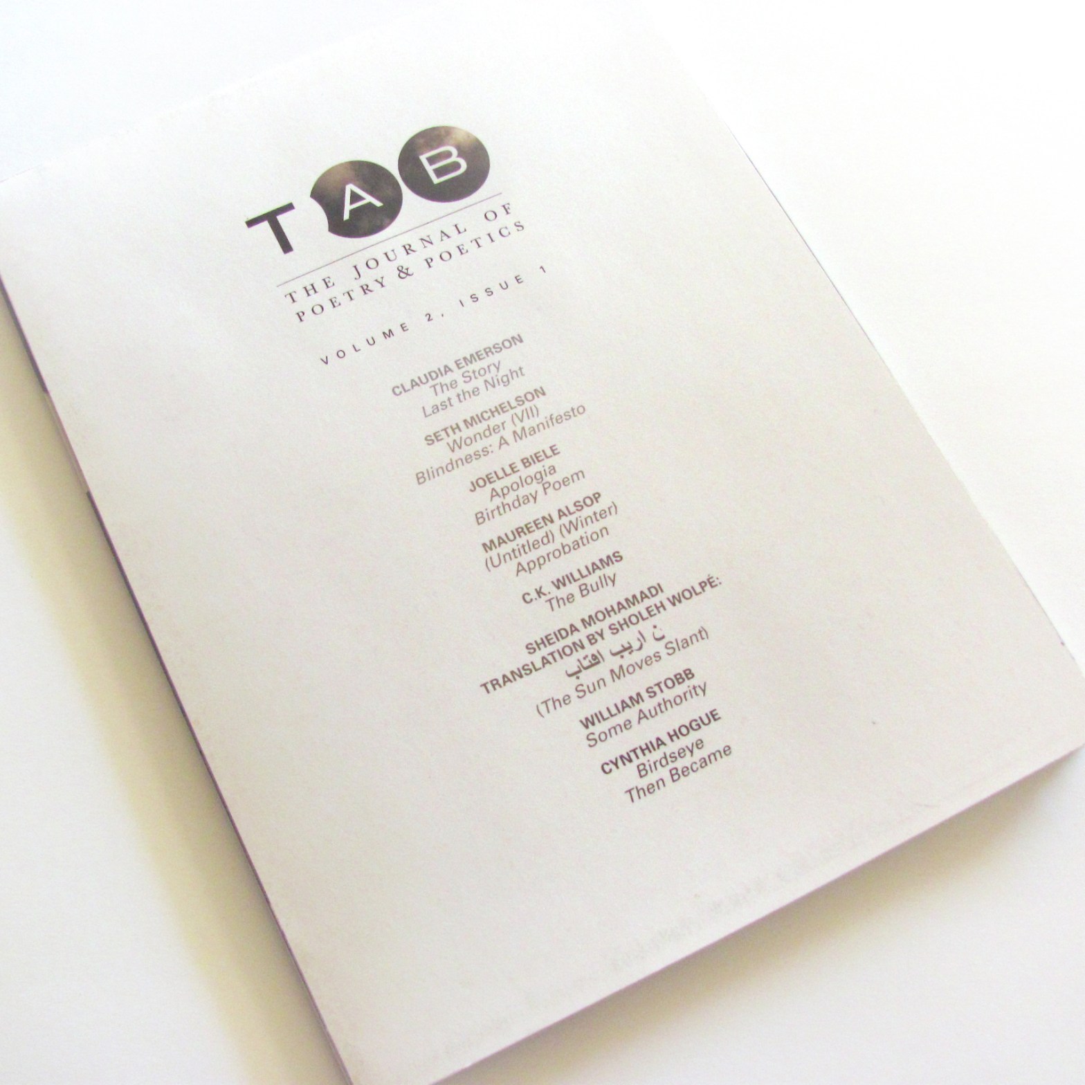 The 2014 print issue embodies an expression of time and space. From beginning of the journal, each page employs atmospheric and, at times, abstract photography of the sky taken at different times of the day. Text has been placed within various objects specifically chosen to interact with light. These objects include water, glass, blinds, wrinkled paper, and windows. The sequence of time is reflected in the progression of the journal, beginning with morning light and moving to night. Experimentation with space is conveyed through the different voices of the authors included in this issue. The issue’s spine is unorthodox, creating unexpected vertical and horizontal movement in the reading experience. The physicality of the object forces the reader to acknowledge its presence. The life of this interactivity becomes an individual journey of pages unwilling to be turned passively. The space in this issue challenges readers to take in more than merely text and image but also a full-body experience of holding and disorientation.