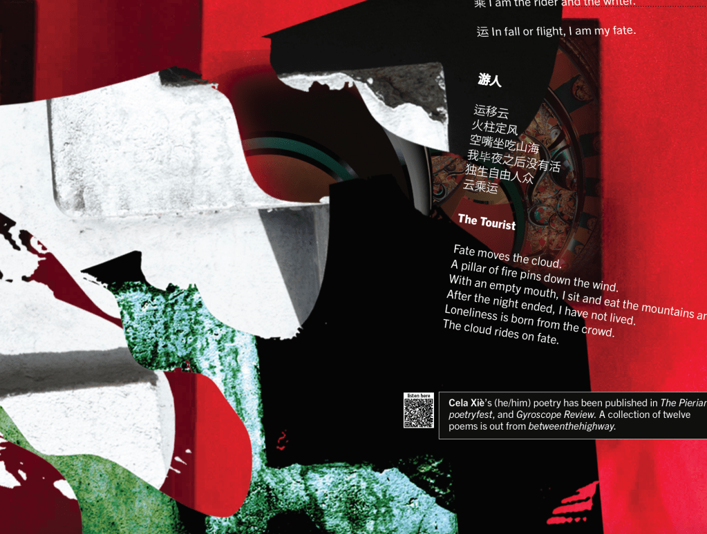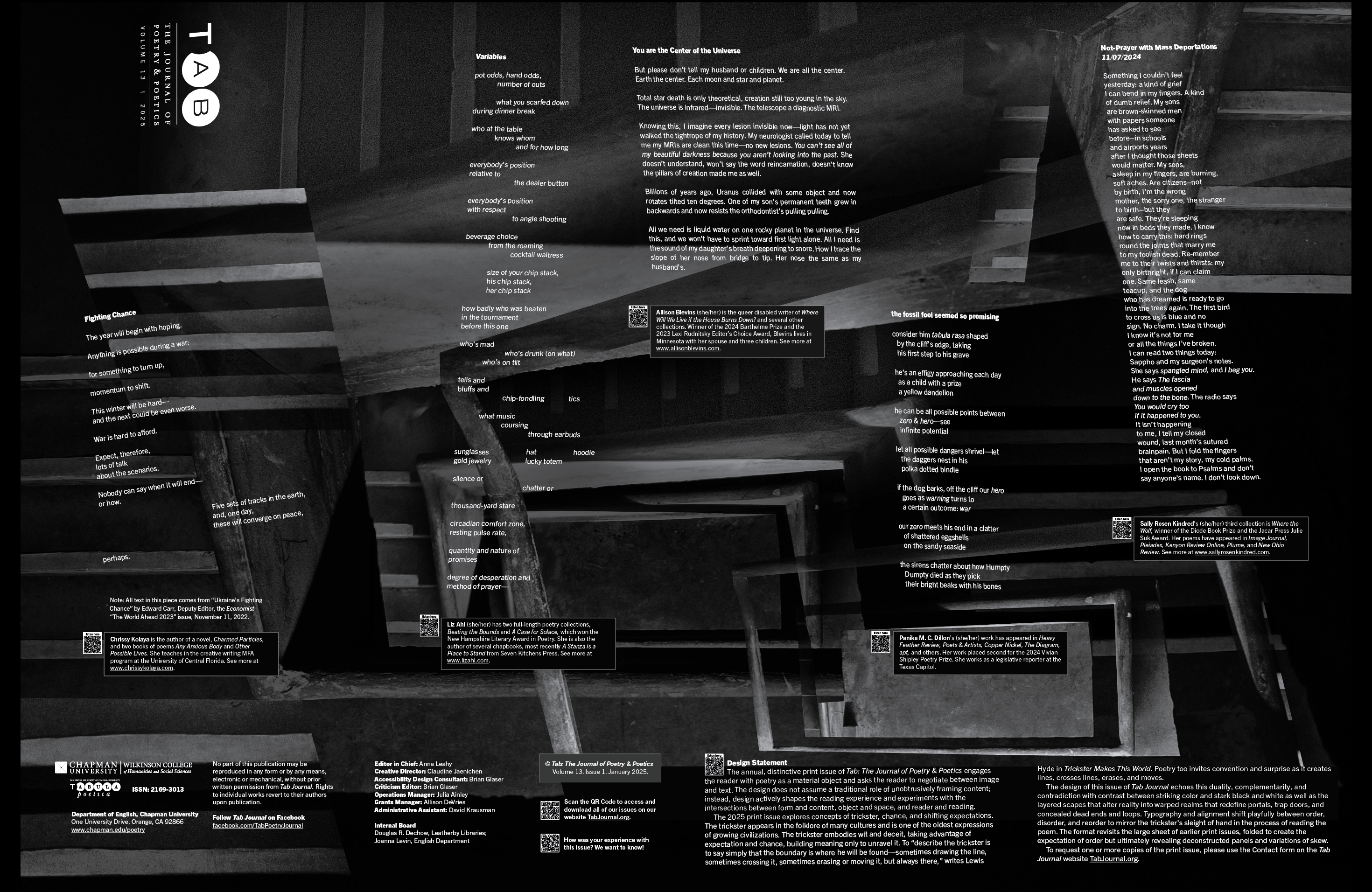 The design of this issue of Tab Journal echoes this duality, complementarity, and contradiction with the contrast between striking color and stark black and white, as well as the layered scapes that alter reality into warped realms that redefine portals, trap doors, and concealed dead ends and loops. Typography and alignment shift playfully between order, disorder, and reorder to mirror the trickster’s sleight of hand in the process of reading the poem. The format revisits the large sheet of earlier print issues, folded to create the expectation of order but ultimately revealing deconstructed panels and variations of skew.