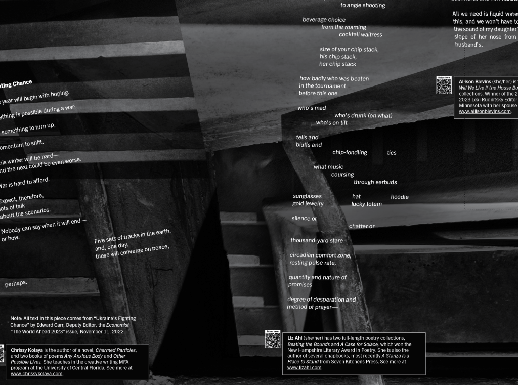 Further, the cards were notched on all sides, which allows the reader to hook them together in various physical forms. It’s relatively straightforward to build a structure that reorients the poems. As with previous print-issue designs, this year’s encourages readers to be aware of reading as an experience.