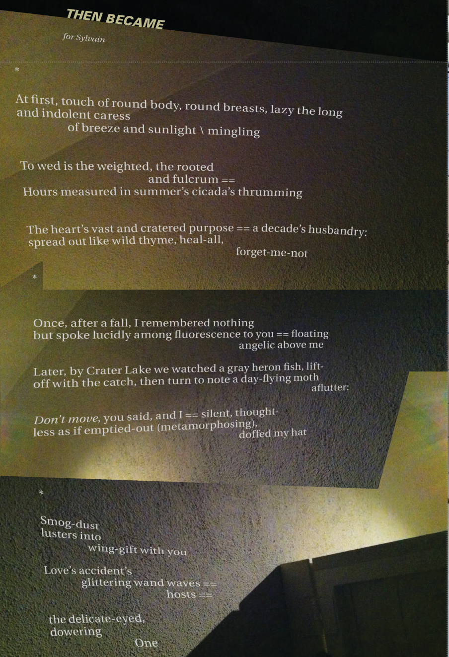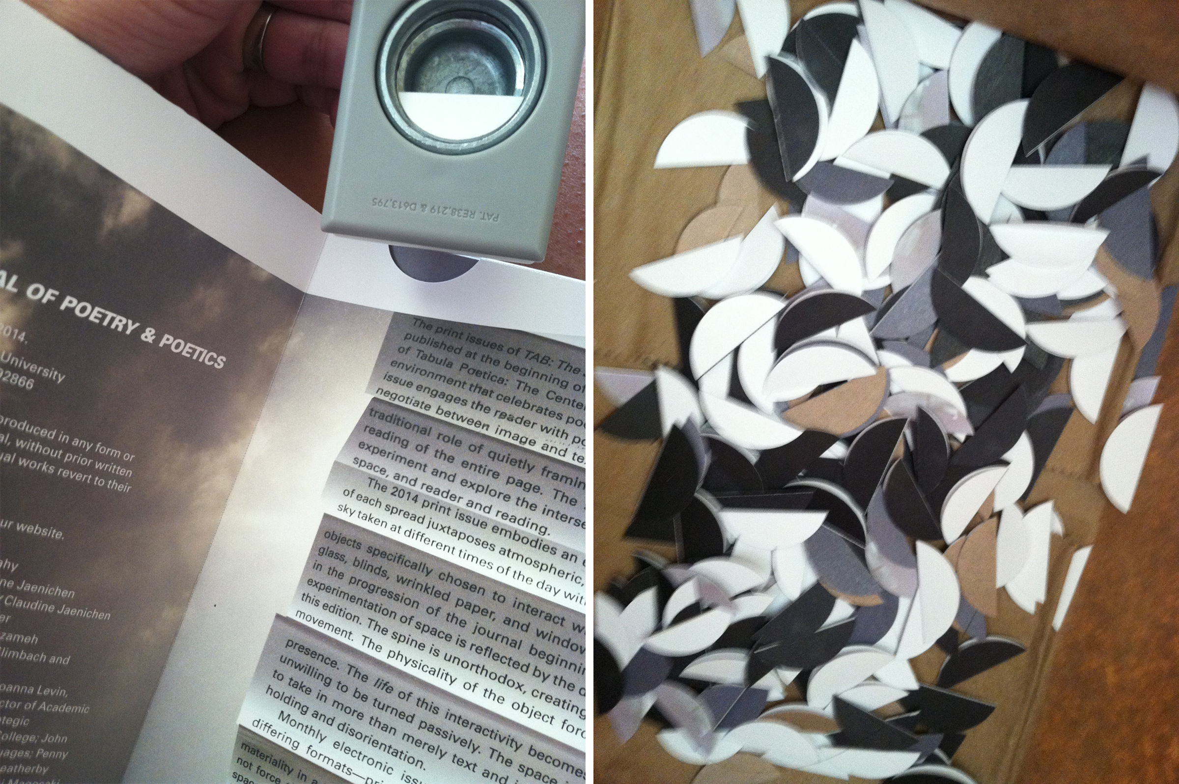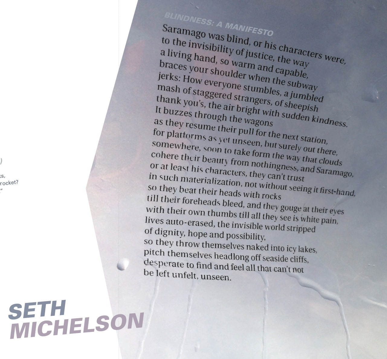The 2014 print issue embodies an expression of time and space. From beginning of the journal, each page employs atmospheric and, at times, abstract photography of the sky taken at different times of the day. Text has been placed within various objects specifically chosen to interact with light. These objects include water, glass, blinds, wrinkled paper, and windows. The sequence of time is reflected in the progression of the journal, beginning with morning light and moving to night. Experimentation with space is conveyed through the different voices of the authors included in this issue. The issue’s spine is unorthodox, creating unexpected vertical and horizontal movement in the reading experience. The physicality of the object forces the reader to acknowledge its presence. The life of this interactivity becomes an individual journey of pages unwilling to be turned passively. The space in this issue challenges readers to take in more than merely text and image but also a full-body experience of holding and disorientation.